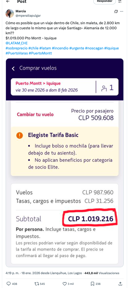 Una usuaria denunció en redes sociales el alto costo de un pasaje aéreo entre Puerto Montt e Iquique, cuyo valor superó el millón de pesos, generando un amplio debate digital. La situación ocurrió el lunes 18 de enero, involucró a la aerolínea LATAM Airlines Group, y motivó una respuesta oficial de la empresa, además del análisis de un economista.